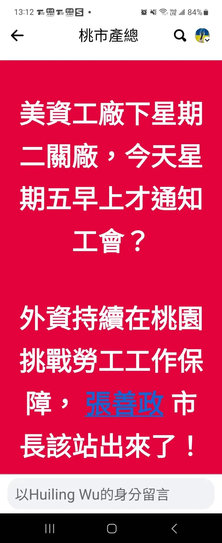 桃產總稍早在臉書貼出公告,美資工廠下周二關廠,今天週五才通知工會,外資持續在桃園挑戰勞工工作保障,張善政市長該站出來!