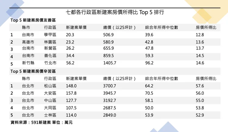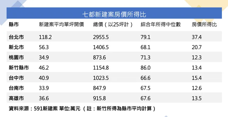 591建案統計平台上七都各行政區新建案平均單坪開價,以常見自住使用的 25坪為基礎計算出各區新屋總價,並比較財政部公布2021年綜所稅各行政區所得總額的中位數,計算全台新建房價所得比,自住客最辛苦區域莫過於台北市,需不吃不喝37.4年才能購買新房,最輕鬆區域則是在桃園市,僅需 12.3年,桃園市目前尚有新屋、觀音、楊梅等平價區,吸引不少首購族目光。