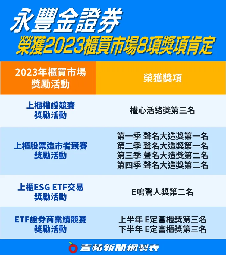 另外,永豐金證券積極推廣存股,這次以新增參與ETF定期定額扣款人數排名前3名,囊括ETF證券商業績競賽奬勵活動上、下半年「E定富櫃奬」第3名,交出亮眼的成績單。