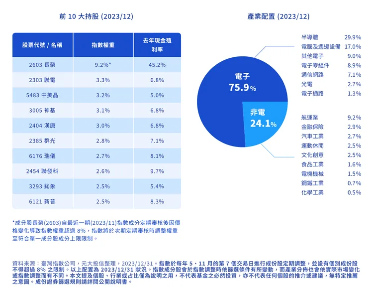 根據元大投信的00940開放申購頁面顯示,成分股前10大持股依序為:長榮(2603)權重9.2%,去年現金殖利率高達45%、聯電(2303)權重6.8%、中美晶(5483)權重3.2%、神基(3005)權重3.1%、漢唐(2404)權重3.0%、群光(2385)權重2.8%、瑞儀(6176)權重2.7%、聯發科(2454)權重2.6%、鈊象(3293)權重2.5%、新普(6121)權重2.5%。