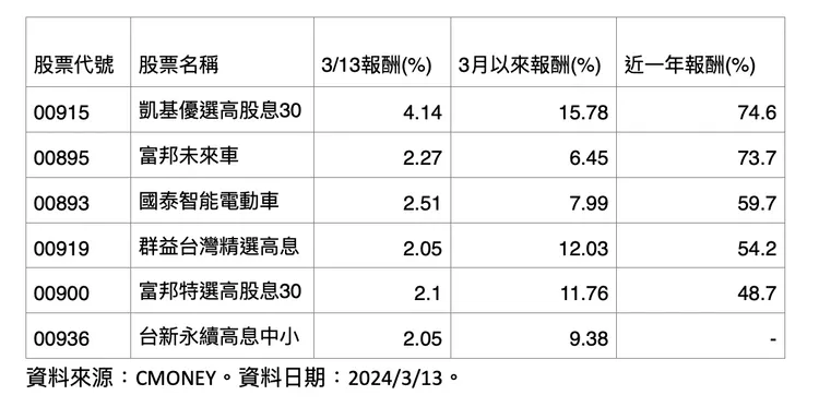 以13日表現來看,主因數檔成分股是盤面上表現強勢的個股,包括新普、鈊象、晶技、力成、長榮鋼,都有半根停板的強勢表現,另外瑞儀與中信金對00915的漲幅也多有貢獻。受惠於在市場震盪之下、有高股息題材保護的00915,3月以來漲幅更達15.78%,近1年報酬率達到74.6%,雙雙超越台積電表現。