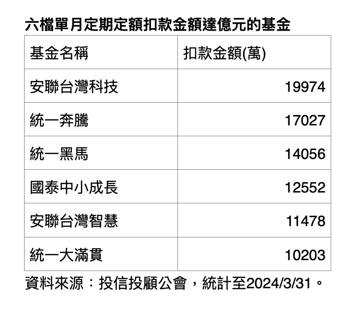 根據投信投顧公會3月底數據,單月定期定額扣款達到億元等級的基金僅有6檔。且清一色為台股基金。其中,統一投信坐擁半數,包括統一奔騰、統一黑馬及統一大滿貫基金,3月定期定額扣款金額分別達到1.7億、1.4億及1億。而統一全天候基金3月定期定額扣款金額暴增23.43%至9346萬,離億元僅一步之遙,也是十大熱門台股基金中成長最快的一檔。
