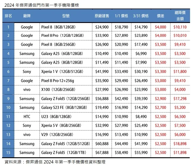 第一季降價排行榜中,三星占了6席、Google占4席,Sony與vivo分別2席以及HTC取得1席,其中Sony的Xperia 1V(12GB/512GB)總降價金額也是破萬元。