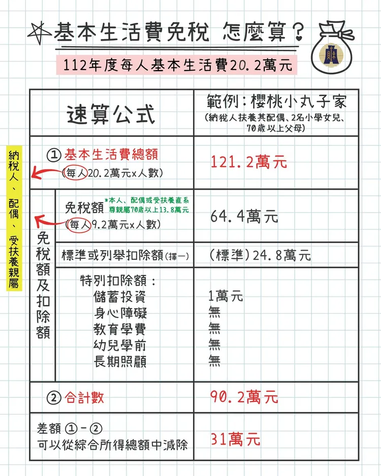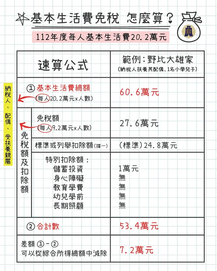 ※生活費差額 :基本生活費 - 免稅額及所有扣除額(標準/列舉擇一、特別扣除額各項)合計。112年度不課稅的基本生活費增加6000元至每人20.2萬。