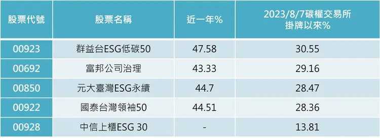 從績效表現來看,就這五檔產品不同期間含息報酬率表現而言,近一年表現都在40%以上,明顯優於加權指數的36.65%,當中以00923漲47.58%表現最佳;若進一步自2023/8/7碳權交易所掛牌這對台灣低碳轉型過程具有里程碑意義的日子以來表現來看,也以00923上漲30.55%漲幅最大,00692則以29.16%居次。