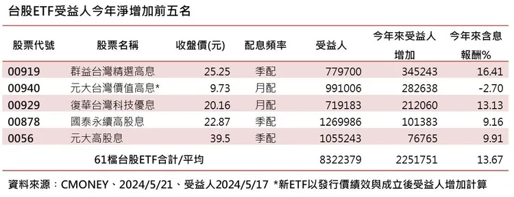 進一步觀察各檔今年來受益人淨增減(扣除今年新成立ETF),其中00919群益台灣精選高息ETF增加34.5萬人最具人氣,其他增加前五名依序分別為00940元大台灣價值高息、00929復華台灣科技優息、00878國泰永續高股息、0056元大高股息,清一色都是高息ETF,且光這五檔就新增加了172.6萬受益人,顯示出台股高息ETF還是最受投資人喜愛。