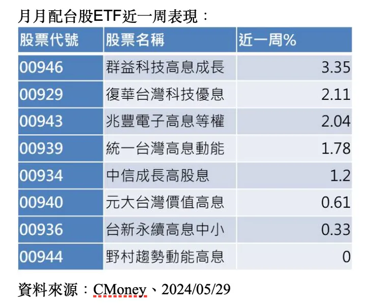 財富管理專家進一步指出,從市場熱議程度高的月月配台股ETF來看,近一周報酬表現前三名分別為00946群益科技高息成長、00929復華台灣科技優息、00943兆豐電子高息等權,而00946的表現之所以最為突出,可歸功於其選股策略之精進,相較其他同樣主打科技高息訴求的台股ETF,00946在成分股篩選機制上,不只更為優化,還更進一步做到差異化,以更精準的選出具投資價值的台灣優質科技高息股。