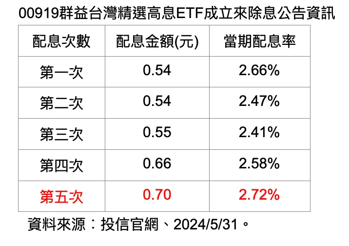 根據群益投信官網最新配息公告顯示,00919本次預估配發金額為新臺幣 0.7元,單次殖利率2.72 %,00919本次除息日為6月24日,參與除息最後買進日為6月21日,配息發放日為7月15日。