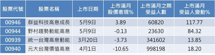 值得留意的是,在此期間,00946的表現也勝過同樣以科技高息股為訴求的台股月配ETF始祖00929復華台灣科技優息。而與00946在同一天掛牌的00944則小跌0.13%,至於00939和00940則在上市第一個月,分別下跌3.73%與10.65%。