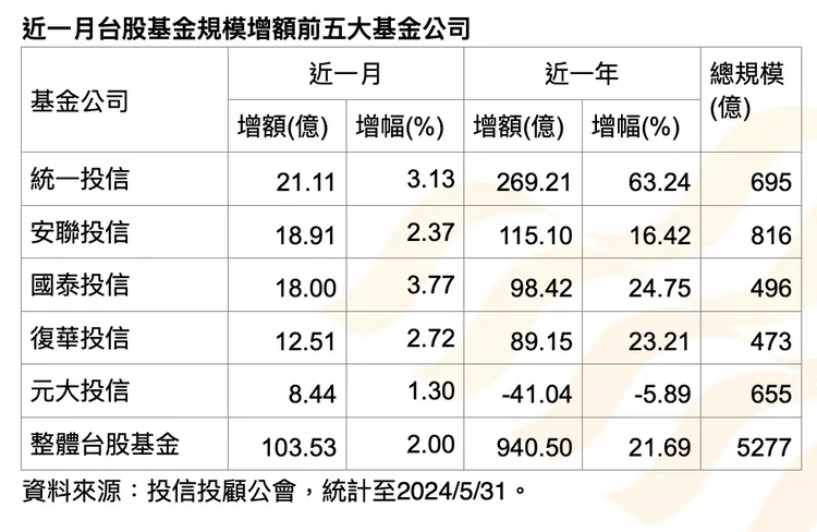 拉長時間至一年,整體台股基金規模成長940.5億,增幅達21.69%,貢獻最多的基金公司仍為統一投信,近一年規模增加269.21億,佔全市場規模增額約3成。統一投信近一年規模大增63.24%,除了由統一奔騰、黑馬、大滿貫及全天候基金等舊基金帶動外,去年9月成立的統一台灣高息優選基金,也帶來巨大貢獻。