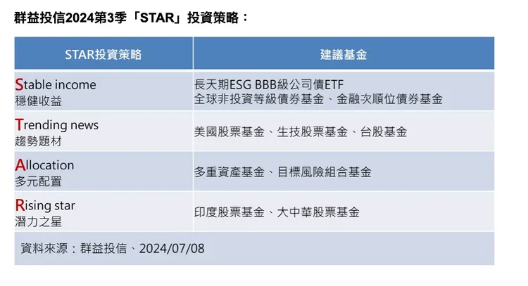群益投信指出,在股債投資題材兼具下 ,宛若月底將登場的巴黎奧運擁有眾多焦點賽事與運動巨星值得關注,第三季建議投資人可採用「STAR」配置策略來因應,S代表Stable income穩健收益,包括長天期ESG BBB級公司債ETF、全球非投資等級債、金融次順位債等優質收益資產;T代表Trending news趨勢題材,包括成長性、題材性俱佳的美股基金、生技基金以及台股基金;A代表Allocation多元配置,訴求以一檔產品滿足跨資產、跨市場靈活配置的投資人可留意多重資產基金、目標風險組合基金;R為Rising star潛力之星,可留意景氣強勁、政治相對穩定且政策題材加持的印度基金,以及官方維穩政策支持,評價有望上調的大中華基金。