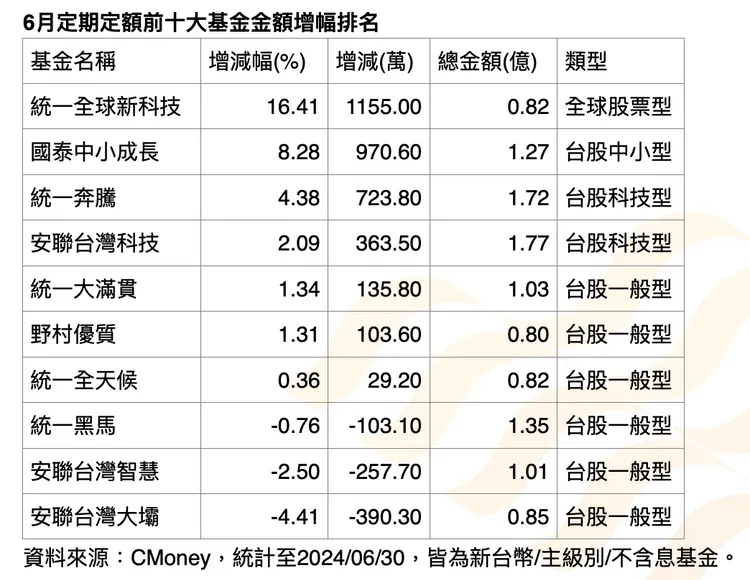根據CMoney數據,6月定期定額扣款排名前十大基金,總扣款金額增加2730萬至11.44億元,有超過4成的增額,是由統一全球新科技基金貢獻。除此之外,榜上有6檔台股基金定期定額金額較上月成長,且半數為統一投信基金。統一奔騰基金6月定期定額金額增加723.8萬至1.72億,為台股科技型基金增額冠軍。統一大滿貫及統一全天候基金,定期定額金額也分別成長至1.03及0.82億元。