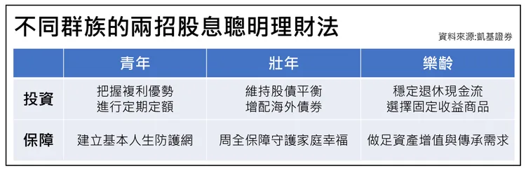 凱基證券提醒,投資與保險都不是買了就能一勞永逸,需根據不同人生階段的責任和家庭狀況進行調整,規劃出符合自身需求的投資組合和保障內容,逐步迎接富足人生。