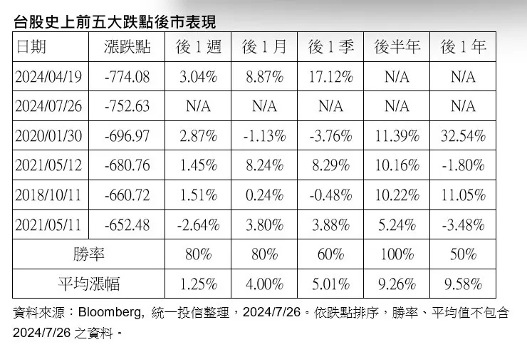 統一投信則表示,近期大盤雖然震盪劇烈,但因台股基本面穩健,企業獲利也持續成長,加上美國Fed可望降息,整體後市並不悲觀,短線拉回反而是中長線進場布局良機。根據Bloomberg統計台股史上單日前五大跌點後1周、後1月、後1季、後半年及後一年表現,平均漲幅分別為1.25%、4.00%、5.01%、9.26%、9.58%,且正報酬機會平均超過七成以上。