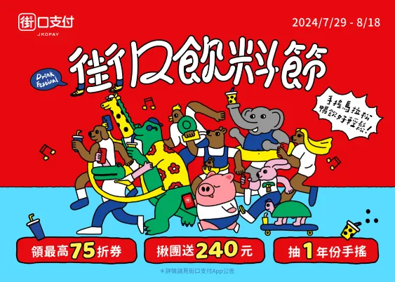 據統計台灣人 2023 年喝掉超過 10 億杯手搖飲,暑假期間更是街口飲料品類消費旺季,對此街口飲料節開放民眾領街口券並於指定店家消費,享不限金額現折 10 元,周末再拿最低 75 折優惠,揪親朋好友在星巴克、路易莎咖啡、清心福全、可不可熟成紅茶、迷客夏消費滿額還可領最高 240 元街口幣。此外,街口支付邀請民眾參與「手搖馬拉松」活動,於清心福全、茶湯會、龜記茗品、鮮茶道、喫茶小舖消費集點,集滿五點就有機會抽中一年份手搖飲(價值 7,500 元),讓你夏日暢飲好輕鬆。