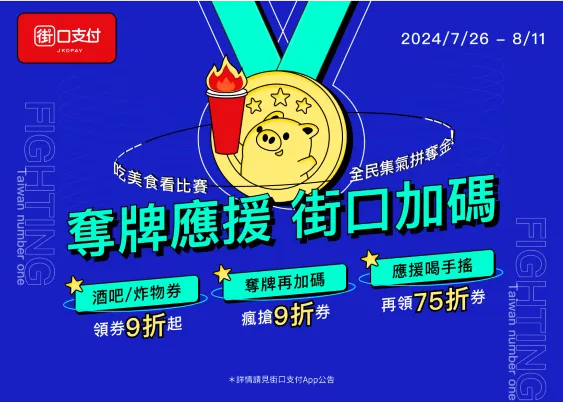 另外,街口支付更祭出三大賽事應援活動:台灣選手成功奪牌再加碼 9 折街口券、購買「Hami Video 運動館 30 天賽事看到飽」街享券打 93 折(特價 185 元),以及在街口支付官方粉絲專頁舉辦「奪牌神預測活動」,民眾於指定貼文留言並成功預測台灣奪牌數,就有機會獲得萬元街口幣,邀請全台民眾一起熱血觀賽,為台灣好手零時差應援。