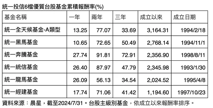 第一,基金淨值。具備高淨值特色的基金,不僅成立時間要夠久,且要在經歷過金融市場多空變化後,仍保持優異的表現,才能讓基金的淨值長期以來仍穩步上升。目前台股基金淨值前三名清一色由統一投信橫掃,包括:統一全天候基金、統一奔騰基金及統一黑馬基金,其中,一直以來穩坐基金淨值王的統一全天候基金,截至7/31,淨值高達304.54元,是目前所有台股基金中第一也是唯一一檔淨值超過300元者;統一奔騰、統一黑馬基金則分別為245.69、214.95元。