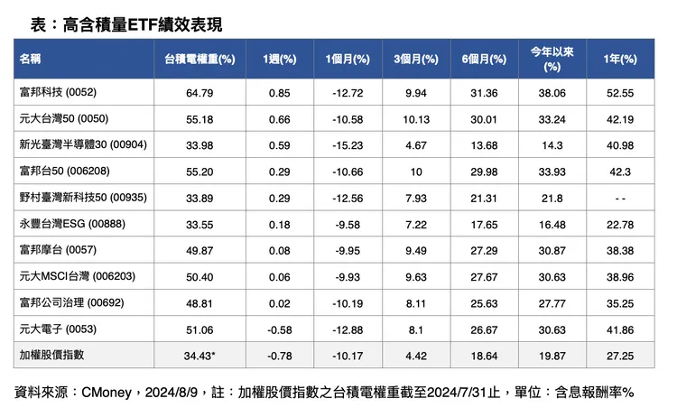 根據CMoney統計,國內ETF持有台積電成分股共27檔,以近1周績效表現來看,富邦科技(0052)上漲0.85%最高、元大台灣50(0050)、新光臺灣半導體30(00904)分別上漲0.66%、0.59%,名列第二、三,至於富邦台50 (006208)、野村臺灣新科技50(00935)也都上漲0.29%,挺進近一周績效排名前五名,