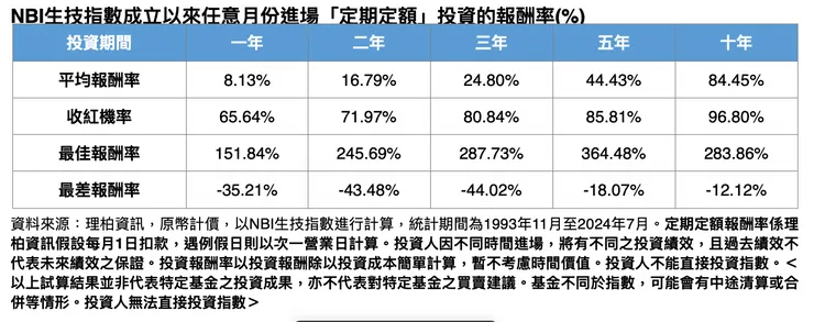 富蘭克林證券投顧表示,科技股和生技股的共同點是波動度向來高於其他產業,尤其是近期整體市況波動加劇之際,讓投資人既害怕接刀,又害怕沒跟到之後的上漲行情,因此不妨選擇「定期定額」且「長期投資」的策略,根據統計,任意期間定期定額投資那斯達克綜合指數以及NBI生技指數三年都能取得不錯的成果,平均漲幅分別達20.24%、24.8%(表一與表二,理柏資訊,原幣計價),正報酬機率均超過八成,此外,投資人也可藉由美國穩定月收益平衡型基金為核心並搭配定期定額投資科技或生技基金來打造攻守兼備的投資組合,並共享科技股中長期投資利基。