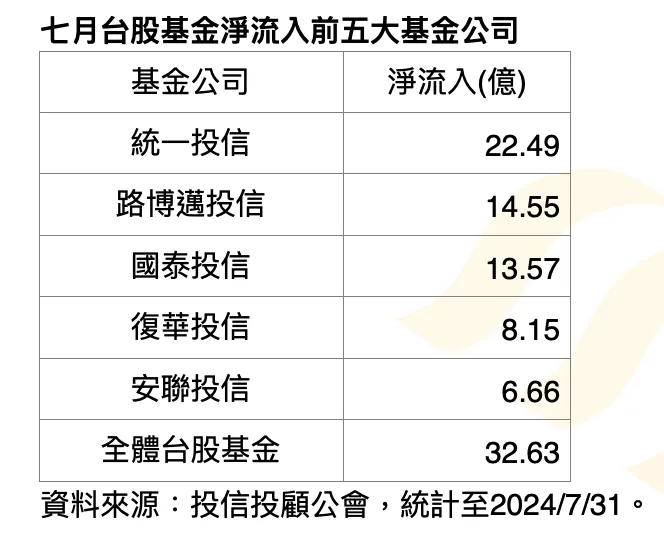 分析個別基金資金流向,投信發行的139檔台股基金中,有17檔基金7月淨流入逾1億,統一投信就佔了5檔,也是上榜檔數最多的基金公司。統一投信獲得資金挹注的台股基金,不僅有規模百億以上的旗艦基金,如統一黑馬及統一奔騰基金淨流入高達7.29億及5.27億,更有後起之秀如統一台灣動力及統一台灣高息優選基金(基金配息來源可能為本金及收益平準金),淨流入達到3.51億及3.3億。今年來表現獲得關注的統一龍馬基金,7月淨流入也有1.61億。