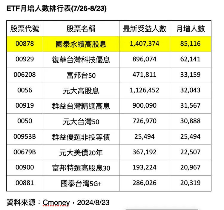 法人分析,國泰永續高股息ETF(00878)從8月中除息以來,人氣持續上漲,主因就是產業分散,有AI、電子半導體跟金融股輪番助攻,充分展現了產業輪動的上漲優勢,加上這兩周金融股好消息一波又一波,讓00878人氣更旺。