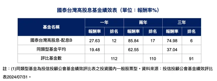 梁恩溢認為,台股歷經修正後,回升行情訊號出現,年線續呈多頭走勢,第四季表現應會優於第三季。根據投信投顧公會最新資料顯示,國泰台灣高股息基金-配息級別B截止至今年7月績效表現亮眼,過去一年報酬率達27.63%、兩年85.84%以及三年74.98%,位列同類型基金前段班。此外,自今年8月19日起,這檔基金進行配息政策調整,將原每半年度分配的投資已實現資本利得,扣除資本損失與應負擔費用後之正數餘額,調整為「每月」分配,以穩定每月收益分配。
