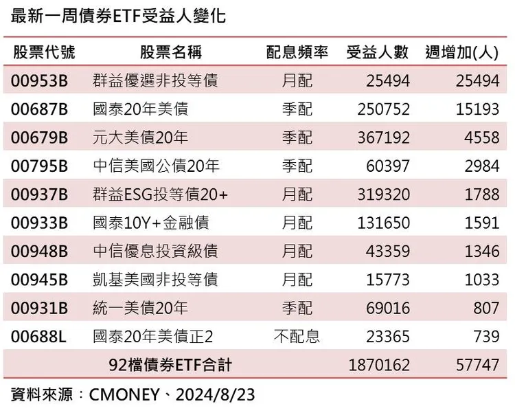 進一步觀察,上周受益人增加的有64檔,以周增加人數來看,00953B群益優選非投等債增加25494人最多。市場法人表示,隨著市場對降息預期提升,後續貨幣政策反轉下的潛在資本利得空間可期,債市投資環境更居順風,投資人若想順勢卡位降息帶來的債市機會,不妨透過債券ETF來參與。