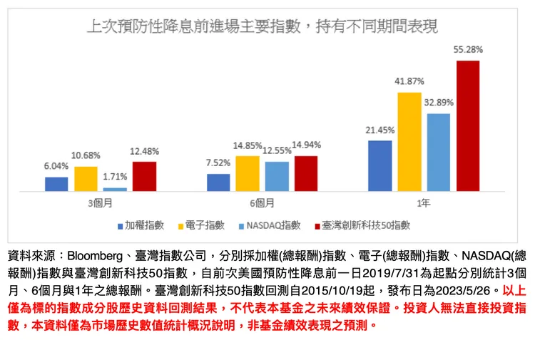 野村投信投資策略部副總經理張繼文表示,根據統計,前一次美國採取預防性降息為2019年8月1日,當時聯準會宣布十年來首次降息措施以支持經濟成長,利率敏感度較高的科技股在首次降息後的一段時間表現不俗,例如NASDAQ指數在預防性降息後3、6與12個月分別上漲1.71%、12.55%與32.89%;值得留意的是,與美國科技股走勢高度連動的台股也有一番亮眼表現,加權指數同期間上漲6.04%、7.52%與21.45%,而電子類股指數亦上揚10.68%、14.85%與41.87%,表現更勝一籌。