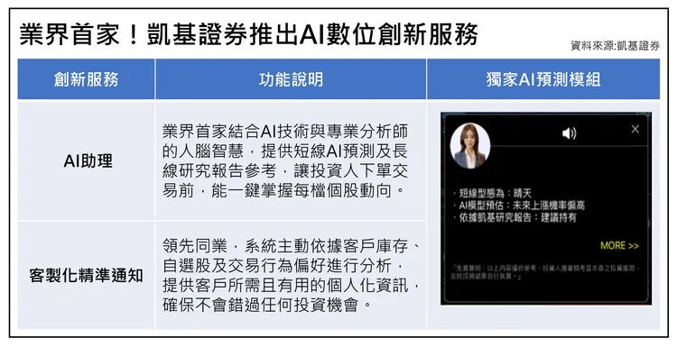 凱基證券秉持「公平同理、待客如己」的精神,致力打造安全友善之金融環境,設計「AI助理」以擬人化方式呈現,分析預測不僅提供文字內容,並可用語音聆聽,彷彿有專業分析師在旁解說每一檔個股,同時讓視障朋友亦能掌握投資資訊;無論是新手或是資深投資人,都能獲得「客製化精準通知」幫助,弭平市場資訊落差,讓投資決策變得更加簡單和高效,建構出更友善的投資服務。