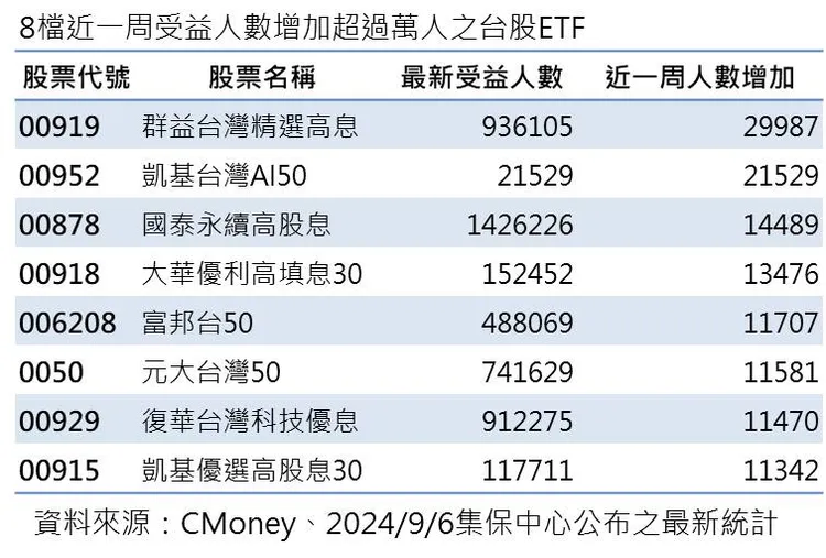 進一步觀察近一周受益人數增加較多、超過萬人的台股ETF,共計有8檔,人數增加最多的是將於9/23除息,且本次每股預估配發金額為0.72元再創新高的00919群益台灣精選高息,受益人周增29,987人,其他上榜的產品還有00952、00878、00918、006208、0050、00929、00915,以類型來看,台股高息ETF仍是投資人心頭好,共計有5檔上榜。