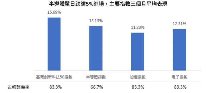 以半導體指數為例,當龍頭台積電大跌日進場該指數持有3個月平均表現可達13.13%,正報酬機率為67%;若選擇加權指數或電子指數,持有3個月平均總報酬亦分別達11.23%與12.31%,表現不俗且正報酬機率提升至83%;投資若聚焦創新科技相關族群,以「臺灣創新科技50指數為例」,大跌時進場持有3個月平均表現達15.69%,正報酬機率高達83%。建議投資人可以鎖定正報酬表現佳的市值型ETF,作為降息前的中長線佈局標的,可望贏戰降息後AI科技股波段大行情。