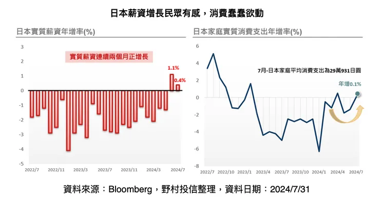 野村投信投資策略部副總經理張繼文分析表示,展望2024年第四季,日本今年「春鬥」最終結果顯示,日本企業同意薪資平均調升5.1%,加薪幅度為33年來最大,日本實質薪資自6月以來已連續2個月呈正增長,顯示出薪資成長終於趕上通膨,並強化外界對工資帶動消費成長良性循環的信心。