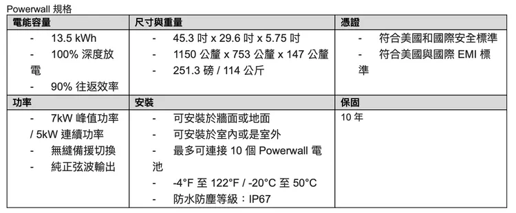 Tesla Energy表示,Powerwall 是一款家用電池,儲能容量為 13.5 kWh,輸出功率為 5 kWh,最多可擴充 10 組,其廣泛的應用涵蓋個人住家、商辦及公共設施。Powerwall 提供台灣各地用戶備用電源,保護住家免受到停電或自然災害影響,並能有效節省電費開支。若將 Powerwall 與太陽能板配對安裝,亦可儲存太陽能以利白天或夜間使用。