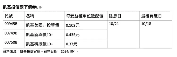 凱基美國非投等債(00945B)透過優化指數選債機制,截至9月30日為止,151檔成分債合力貢獻8.15%的平均票面利率,延續前一個月的票面利率水準,平均殖利率也有7.26%,是追求收益的好工具。若考量預先布局債券的資本利得空間,也可搭配受惠新興市場債市升溫的凱基新興債10+(00749B)、受惠AI趨勢商機的凱基科技債10+(00750B),以及可望創造最佳報酬/風險比的中天期A級企業債-凱基A級公司債(00950B),這3檔債券ETF也都在10月除息行列,可望與00945B合組票息收益與資本利得雙向布局的債券黃金組合。