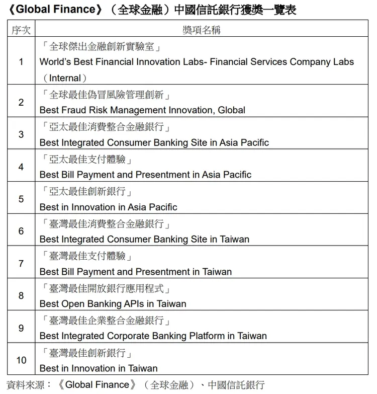 第25屆「World’s Best Digital Banks Awards Ceremony」在英國倫敦銀行大廳會場(Banking Hall, London)舉辦,中國信託銀行數位科技處處長王俊權資深副總經理率團隊親赴英國倫敦領獎。《Global Finance》(全球金融)全球級獎項「全球傑出金融創新實驗室」係透過專家、學者及財經記者組成專門評選委員會,歷經獨立研究、審查與討論,最後經嚴格評選後公布最後得主,中國信託銀行與全球頂尖的金融機構共同角逐,過關斬將抱回世界級榮耀,也成為臺灣首家連續三年蟬聯「全球傑出金融創新實驗室」金融業者。此獎更被創辦人暨總編輯Joseph Giarraputo讚譽,得獎機構成功整合各項金融科技,創造具高度影響力的創新金融解決方案,成功應對當前複雜的金融挑戰,表現卓越。