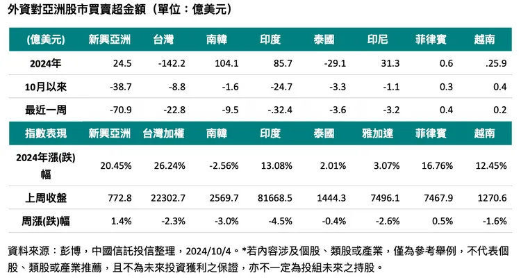 中國信託投信表示,上周五美國公布最新就業數據,優於市場預期,加深投資人對於美國經濟軟著陸預期,加上油價反彈,中國下重手刺激經濟,市場預期,聯準會11月可望縮減降息幅度至1碼,並開始研擬通膨可能復燃的劇本,連帶使得十年期公債殖利率突破3.9%。而美國經濟數據強勁,吸引資金回流美國,新興亞洲指數上周雖漲1.4%,但外資呈淨賣超70.9億美元。其中以印度股市淨流出32.4億美元最多,台股淨流出22.8億美元次之。