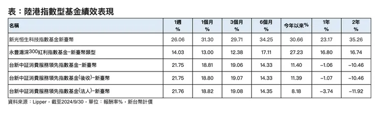 理財專家建議,如果投資人想卡位中國內地大力救市,趁中港股強勢升幅帶動下,掌握合適投資工具參與,建議可以選擇與恒生科技指數連結性高的國內投信發行之指數型基金作布局,同樣是採取被動操作,連結相同成分股的恒生科技指數基金,不管是投資人作為短線或波段操作,或改由定期定額方式作中長線佈局,都是現階段卡位中港股市政策利多、吸引機構投資人掌握估值修復,捕捉科技技術牛市的淘金首選。
