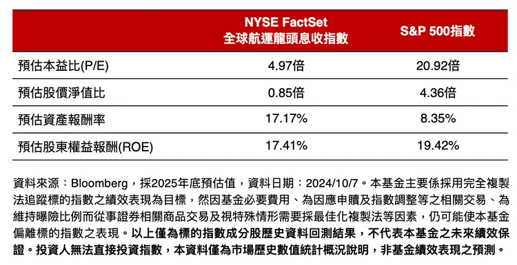 野村全球航運龍頭息收ETF經理人張怡琳進一步表示,航運股與全球經濟成長高度相關,全球貿易有逾九成依賴海運。根據統計,持有航運股一年以上的投資者往往能獲得較佳回報。FactSet全球航運指數的本益比不到五倍,股價淨值比低於一,顯示航運後市具潛力。雖然國際碼頭工人協會10月初暫停罷工,運價短暫回調,但只要經濟穩健,航運股長期看好。