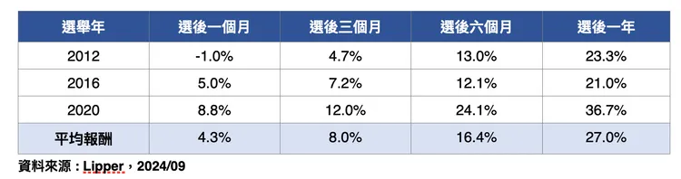 PGIM Jennison美國成長基金產品經理彭子芸表示,回顧過去3次美國總統大選後S&P500指數走勢,除2012當年選後一個月美股出現-1%回落,選後三個月、六個月、一年全數呈現多頭態勢,且隨時間拉長,漲幅也跟進擴大,選後六個月美股平均漲幅來到雙位數,反映出選後不論在政策、經濟發展等塵埃落定後,股市將重新反應基本面表現。