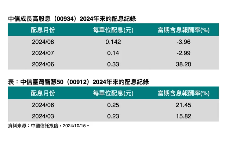 另一檔即將除息的是中信臺灣智慧50(00912),採取季配息機制,本次實際配發金額為0.66元。張圭慧表示,台積電日前公布9月營收,輕易達成財測高標,且10月17日將舉辦法說,法人對其後市多樂觀看待。在AI需求驅動下,半導體先進製程產能仍供不應求,且消費性電子產品去庫存告一段落,加上美國經濟依然強韌,投資人對美國經濟「軟著陸」仍具信心,台股後市不看淡。