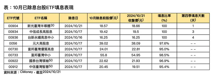 根據證交所統計,10月除息ETF進入尾聲,本周還剩最後6檔,主要集中在科技型、市值型兩大類,包括21日由新光臺灣半導體30 (00904)除息打頭陣;22日FT臺灣Smart(00905)、復華台灣科技優息(00929)、群益半導體收益(00927)等3檔上場;24日最後以永豐臺灣加權(006204)、永豐台灣ESG(00888)兩檔作壓軸,截至10/21止,目前10月已參與除息的台股ETF中,已有新光臺灣半導體30 (00904)、中信成長高股息(00934)、台新永續高息中小(00936)等3檔完成填息,且時間都縮短至1到4天不等。