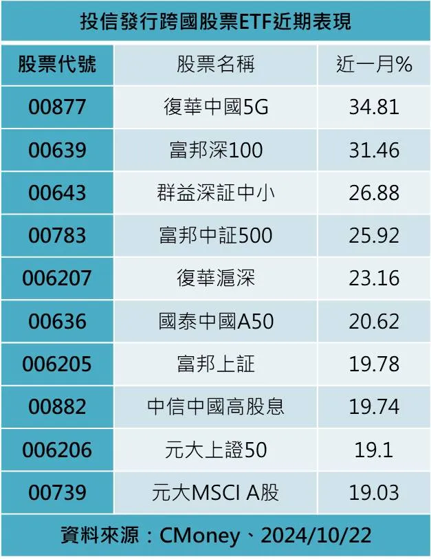 在政策刺激連發下,也帶動近期中國股市表現,近一月滬深300指數上漲近22%,代表中小型股的中小企業100指數漲幅更近25%,連帶投信發行之跨國股票ETF近一月表現,前十強也全由中國相關股票ETF霸榜,上榜的產品包括復華中國5G、00643群益深証中小、富邦深100、國泰中國A50等等。