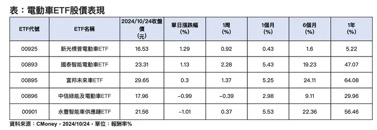 持有特斯拉佔第二大的國泰智能電動車ETF(00893),上漲1.13%居次,至於特斯拉佔第三大持股的富邦未來車ETF(00892)亦上漲0.30%,表現第三。投信法人表示,特斯拉先前推出自駕相關產品概念後,最新釋出明年新推出低價版電動車搶市,等於為未來電動車銷量成績打上強心針,有利於電動車利基個股及相關ETF,中長線股價表現仍持續看好。