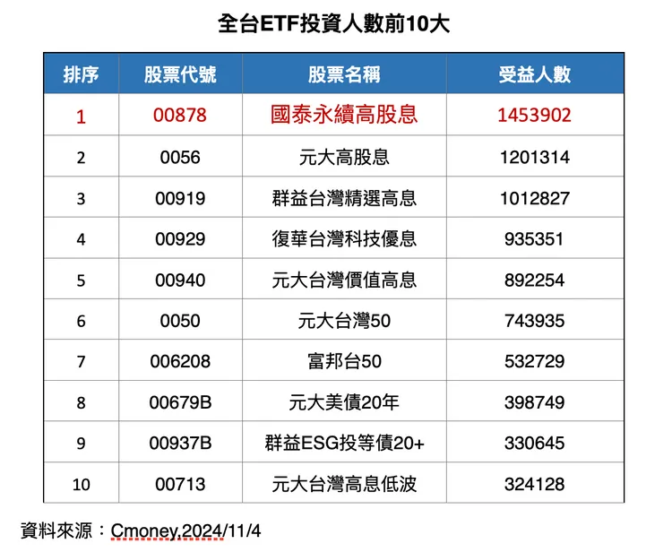 ETF專家表示,目前市場投資人數前五大的ETF分別是國泰永續高股息(00878)受益人達1453902人、元大高股息(0056)受益人達1201314人、群益台灣精選高息(00919)受益人達1012827人、復華台灣科技優息(00929)受益人達935351人、元大台灣價值高息(00940)受益人達892254人,即使全台ETF超過260多檔,可以看到台灣人的最愛仍然是高股息ETF。