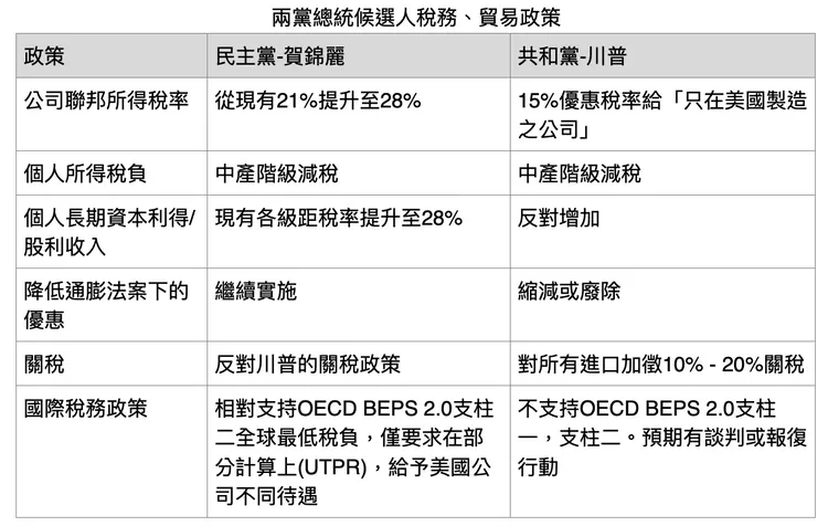 安永聯合會計師事務所國際及併購重組稅務諮詢服務周黎芳執業會計師指出,美臺快速雙重稅收減免法案和租稅協定談判是在拜登任期內提出,若賀錦麗當選,美臺快速雙重稅收減免法案通過生效可能更加快速,意味著美國公司股利匯出給臺灣母公司股利扣繳稅率將降至10%。然而,民主黨的政策同時主張增加美國公司聯邦所得稅率,此舉將削減了股利扣繳降低的優惠幅度。