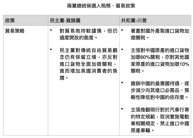 在貿易政策方面,安永聯合會計師事務所全球貿易及供應鏈稅務諮詢服務吳雅君執業會計師分析,無論誰入主白宮,雙方政策皆聚焦於強化本土供應鏈並減少對中國的依賴,但在各自政策適用的範圍與強度不同。賀錦麗大方向上延續拜登政府的政策,適度保障美國勞工與環境等前提下促進發展,同時推動經濟發展。