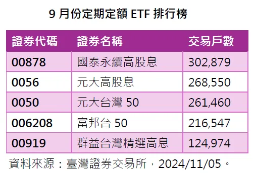 老牛也建議投資人如果選不出要投資哪檔高息ETF,不妨看看別人怎麼選,根據投信投顧公會統計,9月份定期定額受益人數最多的前三名ETF分別是國泰永續高股息(00878)、元大高股息(0056)及元大台灣50(0050),其中便有2檔是高股息,顯見高股息在投資人心中的地位。