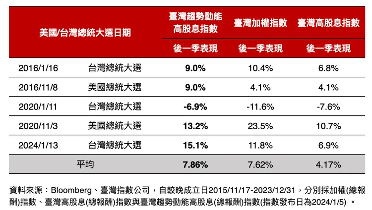 野村投信指出,選後政策題材股將成為盤面焦點,除了短期政策題材外,投資人可關注高股息類型ETF,適合中長期布局。00944野村臺灣趨勢動能高股息ETF經理人林怡君分析,根據過去五次台美總統大選的數據(台灣三次、美國兩次),臺灣加權指數的平均報酬後三個月(60個交易日)平均表現為+7.62%,臺灣高股息指數的平均報酬為+4.17%。若透過「強勢高息股」策略,以00944追蹤的「臺灣趨勢動能高股息指數」為例,平均表現可拉高至+7.86%,相較其他指數,表現更為抗跌。