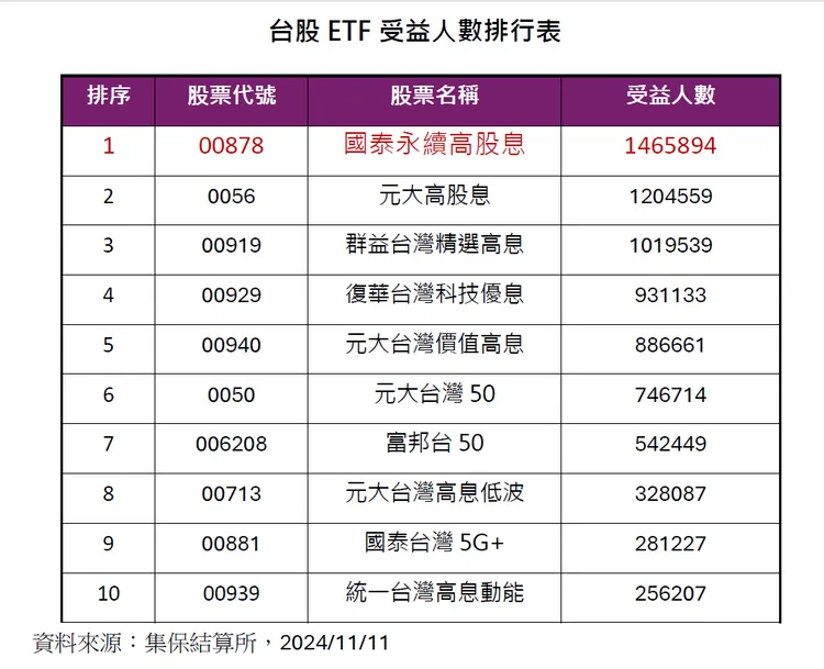 ETF專家分析,觀察市場投資人數最多的前五檔台股ETF,分別是00878的1465894人、0056的1204559人、00919的1019539人,以及00929的931133人,00940的886661人,五檔合計就有5507786人,包辦了超過一半的台股ETF市場。