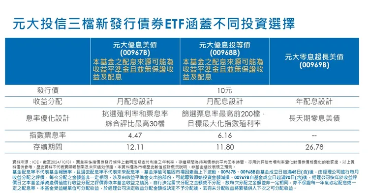 觀察到許多投資人透過債券配息進行再投資或其他運用,本次元大投信推出低門檻10元發行,採月配息設計的元大優息美債(00967B)、元大優息投等債(00968B),應對可能的降息循環均具有收益配置優勢,兩者標的指數並針對納入債券之票息率高低進行篩選,以最大化指數殖利率為目標進行權重調整,前者適合承受最低程度風險的投資人,例如退休族,後者適合穩健型投資人。